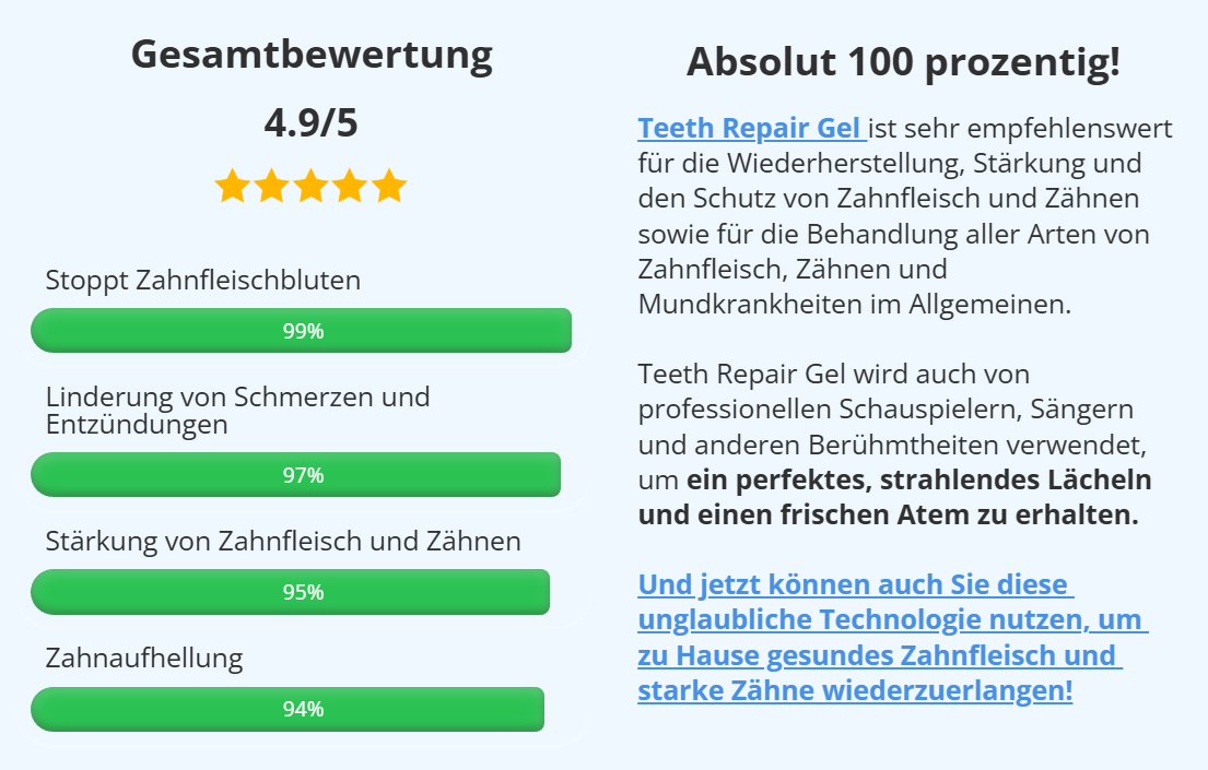 Teeth Repair Gel ist eine natürliche Alternative, die eine Reihe von teuren Zahnbehandlungen sowie verschreibungspflichtige und rezeptfreie Mundpflegeprodukte ersetzt, da es hilft, Ihr Zahnfleisch schnell und schmerzlos wiederherzustellen und zu stärken, damit Sie ein gesundes, weißes Lächeln und einen frischen Atem haben!