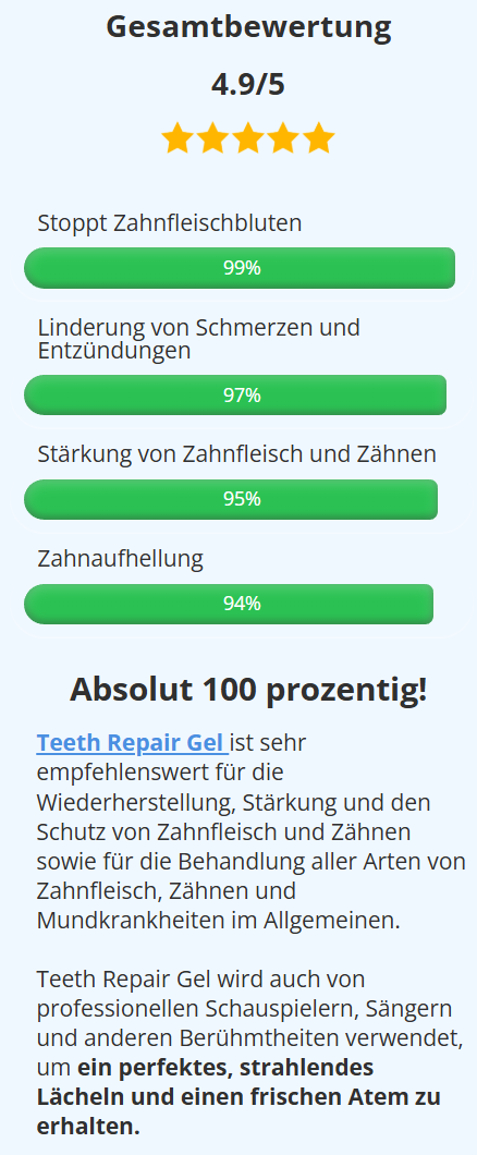 ZUSAMMENFASSUNG: Experten schätzen, dass jeder zweite Mensch auf der Welt unter Zahnfleischproblemen leidet... Diese geniale Erfindung könnte ihr natürlicher Weg sein, ihr Zahnfleisch fast augenblicklich zu behandeln und zu stärken, Blutungen zu stoppen, Zahnverlust und andere ernsthafte Zahnprobleme zu verhindern... Bestellen Sie Teeth Repair Gel mit 50% Rabatt und kostenlosem Versand, solange es noch auf Lager ist...